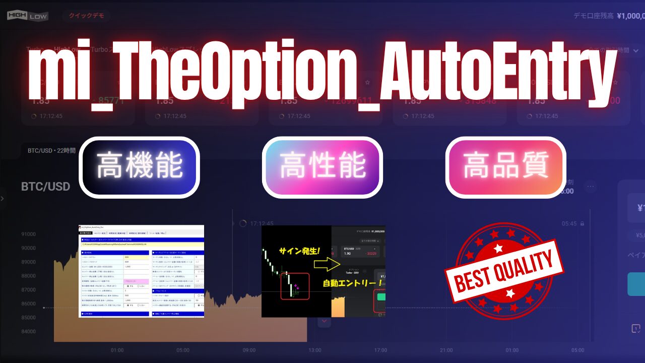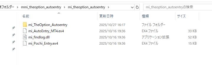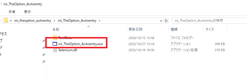 | mi_TheOption_Autoentry | 【自動エントリーツール】のルートフォルダーとなります。配下にEXEやデータを格納するフォルダが存在します。 |