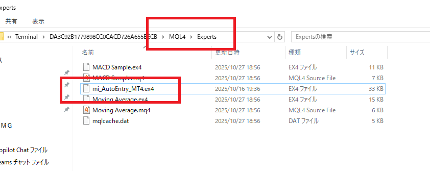 認証設定(WebRequest)の設定が完了しましたら、以下の手順に従い、指定フォルダーに「mi_AutoEntry_MT4.ex4」の格納を行います。