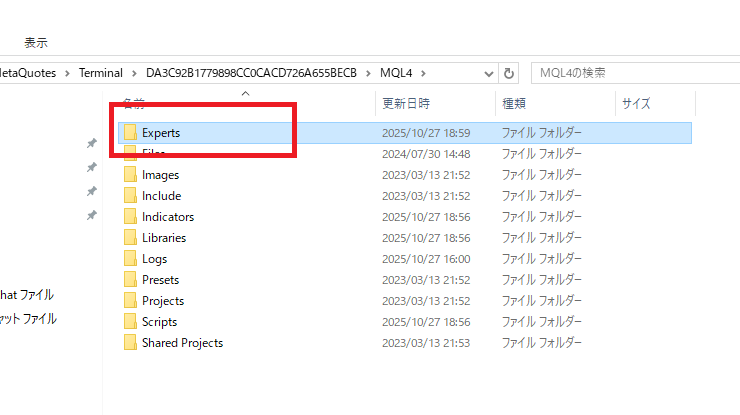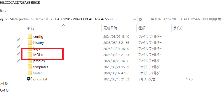 コピーしたフォルダーを、下図のMQL4フォルダーへ貼り付けてください。