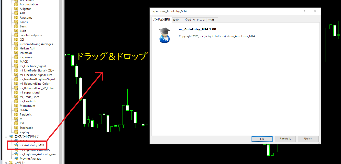 ★後は、使用したい通貨に「mi_AutoEntry_MT4.ex4 」を挿入していきます。