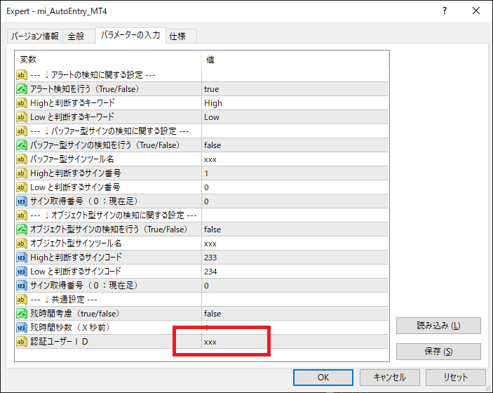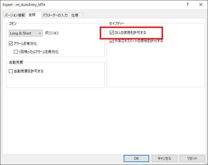mi_AutoEntry_MT4.ex4が使用するユーザー認証を有効にするため、以下の設定を行います。