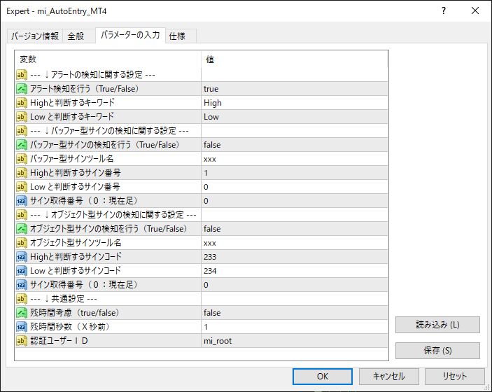 | mi_AutoEntry_MT4.ex4 | 【MT4配置用】MT4のサインを自動的に検知し、「自動エントリーツール」へ情報を送信します。 |