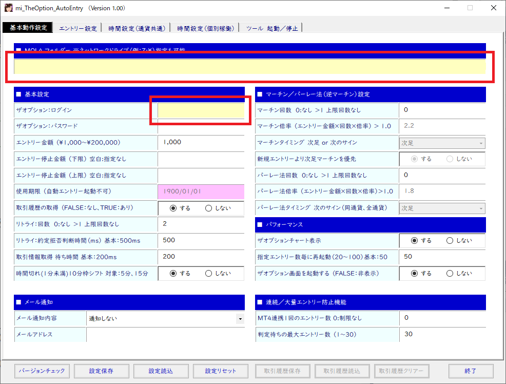 赤枠で示された、基本動作の設定の ”MQL4フォルダ” と ”ザオプション:ログイン” を設定します。”ザオプション:ログイン”は、無料版であれば「デモ利用ID」、有料版であれば「ザオプションのユーザーID」となります。